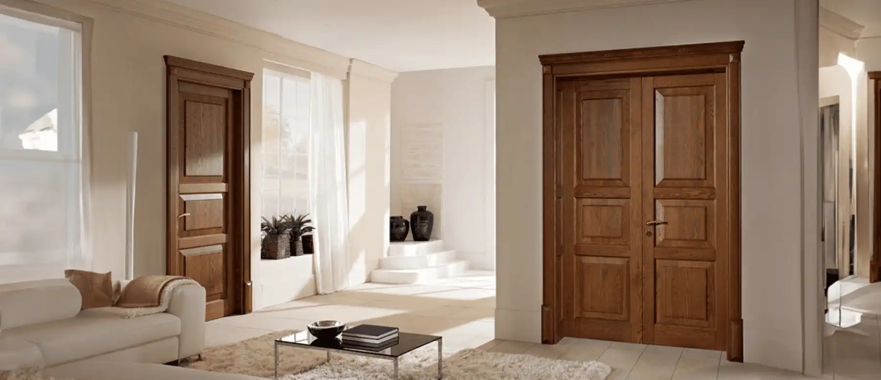 Această ușă de interior combină eleganța minimalistă cu elemente subtile de futurism. Realizată dintr-un material translucid, cu reflexii metalice delicate, ușa pare să plutească în cadrul său, creând impresia unei separări aproape invizibile între camere. Marginile sunt finisate în aluminiu periat, cu inserții subtile de lumini LED, care oferă o strălucire discretă pe timp de noapte. Mânerul ergonomic este sculptat dintr-un material asemănător obsidianului, emanând o senzație tactilă fină și plăcută. Când ușa este închisă, sunetul este aproape inexistent datorită tehnologiei de amortizare magnetică integrate. Designul futurist al ușii se potrivește perfect cu interioarele moderne, oferind o senzație de spațiu și lumină chiar și în cele mai mici încăperi.